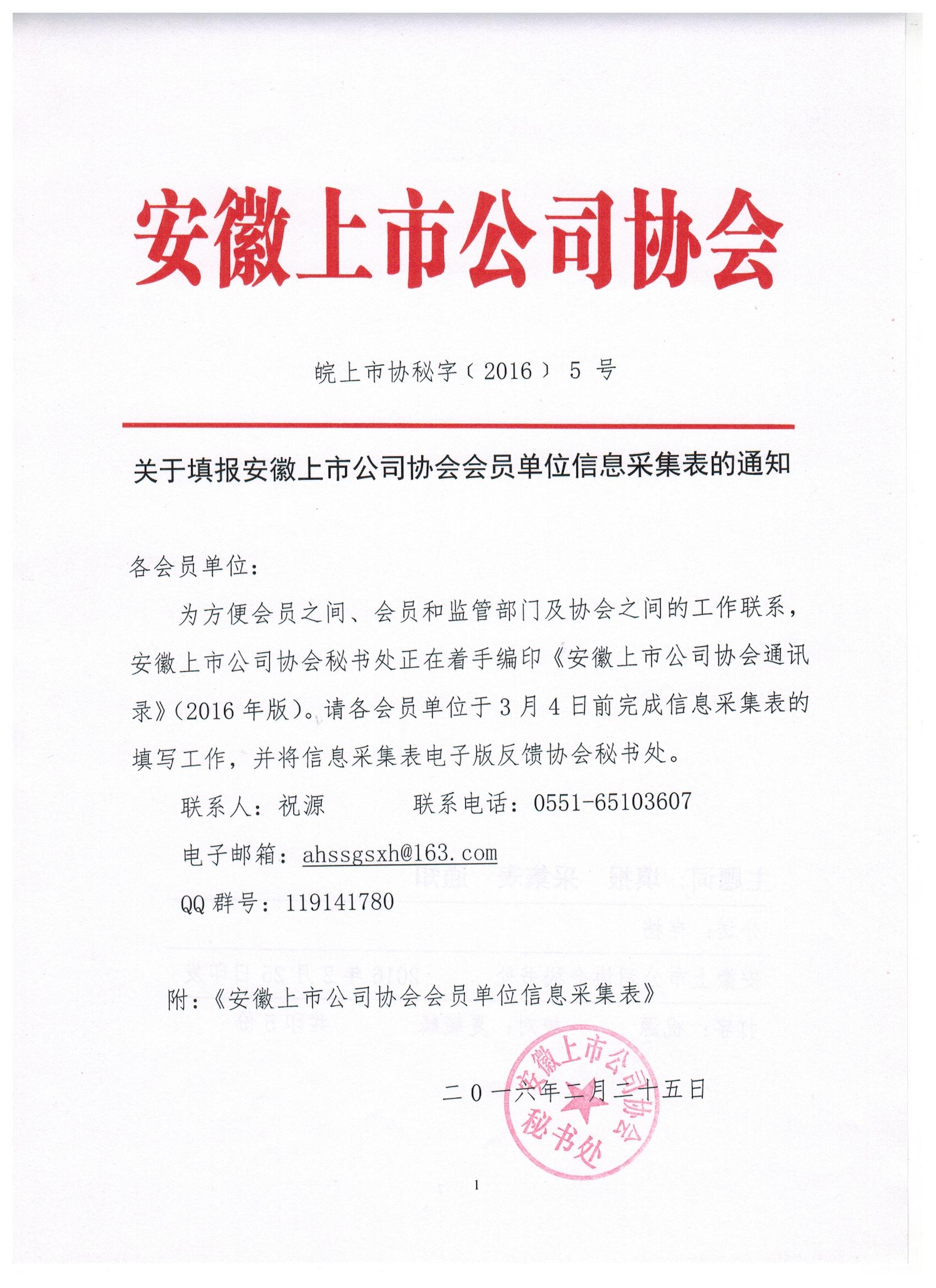 為方便會(huì)員之間、會(huì)員和監(jiān)管部門及協(xié)會(huì)之間的工作聯(lián)系,安徽上市公司協(xié)會(huì)秘書處正在著手編印《安徽上市公司協(xié)會(huì)通訊錄》(2016年版)。請(qǐng)各會(huì)員單位于3月4日前完成信息采集表的填寫工作,并將信息采集表電子版反饋協(xié)會(huì)秘書處。