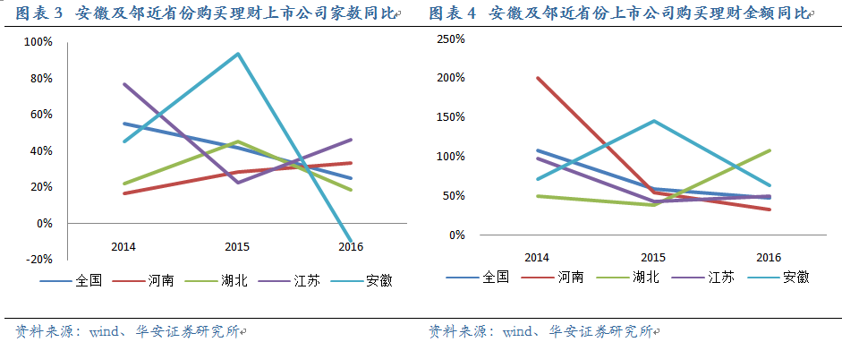 統(tǒng)計(jì)上市公司購(gòu)買理財(cái)?shù)脑鏊?,我們發(fā)現(xiàn)15、16年安徽的數(shù)據(jù)經(jīng)歷了一個(gè)明顯的轉(zhuǎn)折,有異于全國(guó)和鄰近省份。無(wú)論是購(gòu)買理財(cái)?shù)臄?shù)額還是購(gòu)買理財(cái)公司的家數(shù),15年安徽的增速遠(yuǎn)遠(yuǎn)超過(guò)其他省份(數(shù)額增速達(dá)146%,家數(shù)增速達(dá)94%),緊接著16年出現(xiàn)顯著的下滑。