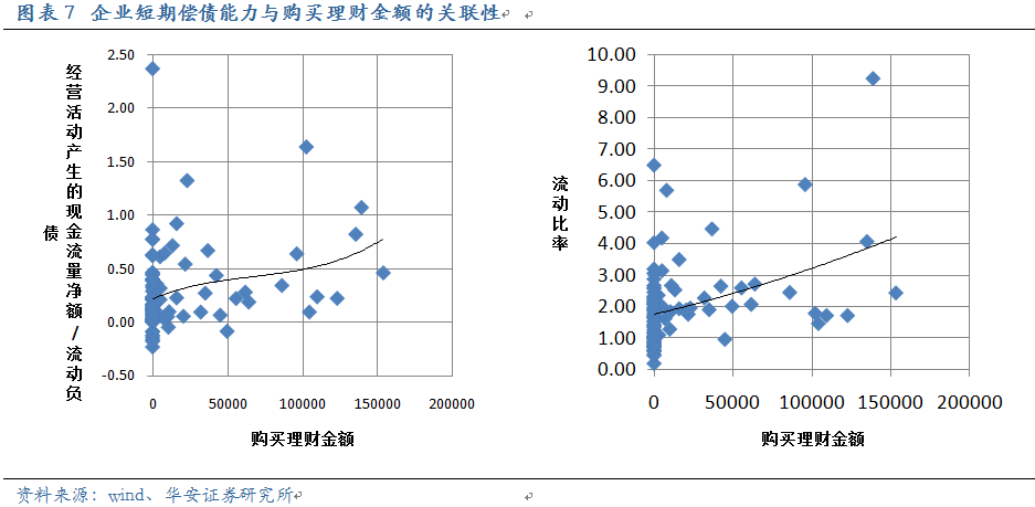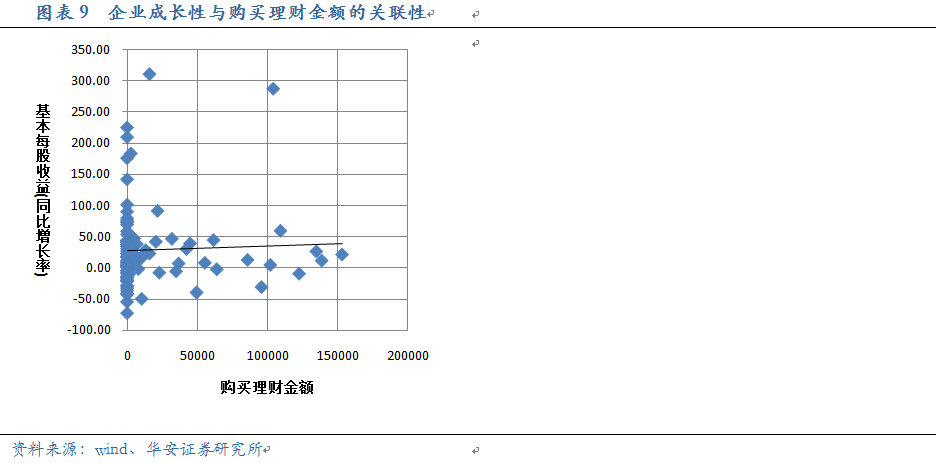 我們考察了上述企業(yè)的主業(yè)的相關(guān)財(cái)務(wù)指標(biāo),包括營(yíng)業(yè)利潤(rùn)、主營(yíng)業(yè)務(wù)比率等,發(fā)現(xiàn)每個(gè)財(cái)務(wù)年度企業(yè)購(gòu)置理財(cái)規(guī)模與當(dāng)期主營(yíng)業(yè)務(wù)水平之間目前并無(wú)明顯聯(lián)系。一方面可能因?yàn)榻y(tǒng)計(jì)期限較短,標(biāo)的公司較少;另一方面,《指引2號(hào)》限制了企業(yè)購(gòu)買理財(cái)?shù)馁Y金來(lái)源及規(guī)模,且只能投向流動(dòng)性較好、安全性高的理財(cái)產(chǎn)品,這意味著作為非主營(yíng)收入的一部分,大部分公司購(gòu)置理財(cái)對(duì)主業(yè)的沖擊有限。