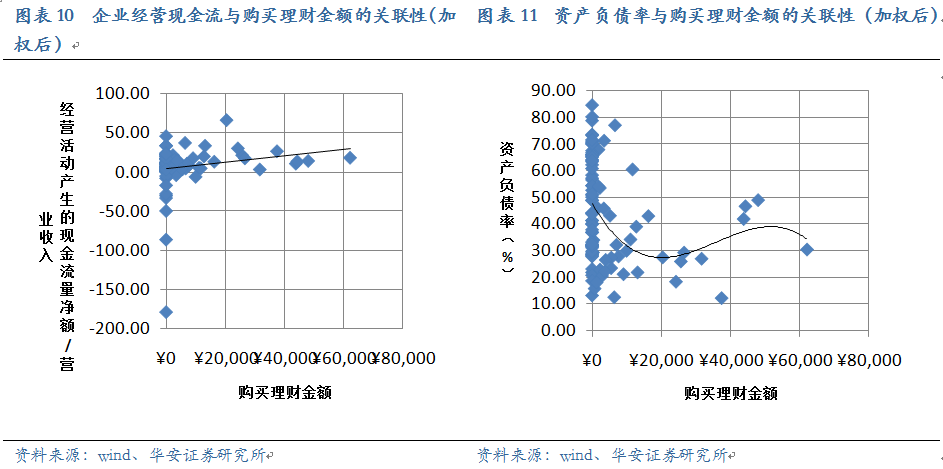 同樣資產(chǎn)負(fù)債率和EBITDA/利息費(fèi)用的高低也與購(gòu)買理財(cái)關(guān)系不明顯。我們可以理解為企業(yè)的長(zhǎng)期償債能力對(duì)購(gòu)買理財(cái)?shù)男袨橛绊懞苄?/span>