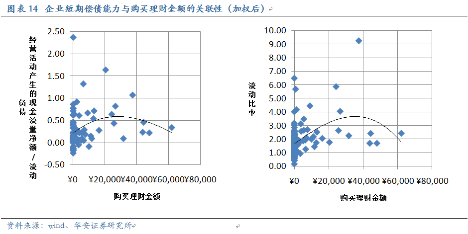 通過(guò)和加權(quán)前的數(shù)據(jù)對(duì)比,我們發(fā)現(xiàn):加權(quán)前,短期償債能力越強(qiáng)的企業(yè),購(gòu)置理財(cái)?shù)囊?guī)模越大,兩者間存在一定程度的線性關(guān)系;而加權(quán)后,原先比較明顯的線性關(guān)系消失了。那些短期償債能力最強(qiáng)、現(xiàn)金流充沛的公司,加權(quán)后的購(gòu)置理財(cái)規(guī)模并不是最高的,而是居于整體的中間位置。說(shuō)明這些公司購(gòu)置理財(cái)?shù)漠?dāng)期規(guī)模雖大,但加權(quán)后的規(guī)模屬于適中,即理財(cái)?shù)拇胬m(xù)期偏短。這種控制理財(cái)期限的方式是值得肯定的。他們放棄了對(duì)長(zhǎng)端收益率的追求,但獲得的是更多的投資機(jī)會(huì),且在一定程度上避免了利率風(fēng)險(xiǎn)。