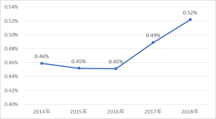 2018年,安徽上市公司累計(jì)總資產(chǎn)規(guī)模為12,649.57億元(見(jiàn)圖2-1),全省累計(jì)總資產(chǎn)占全國(guó)總資產(chǎn)比重達(dá)到0.52%(見(jiàn)圖2-2)。上市公司總資產(chǎn)規(guī)模增加的主要原因之一是淮北礦業(yè)(600985.SH)重組上市導(dǎo)致上市公司由原24.19億元的總資產(chǎn)規(guī)模躍至589.57億元。