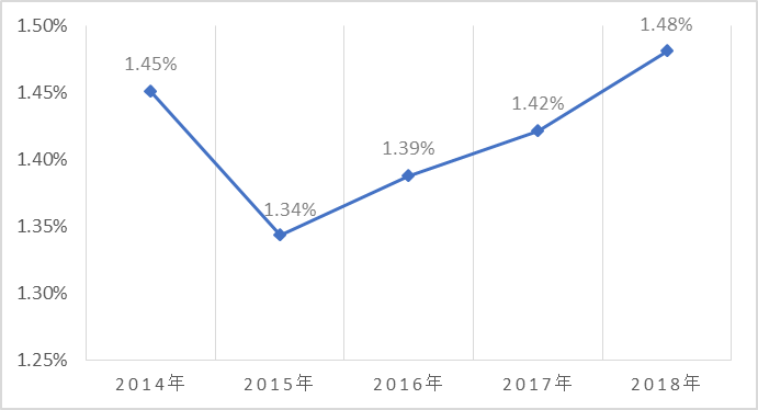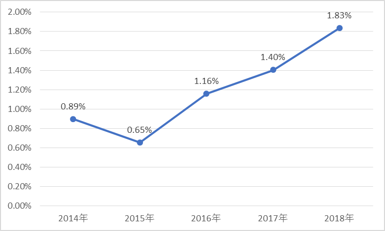 圖2-2 2014-2018年安徽上市公司累計(jì)總資產(chǎn)全國(guó)占比變化