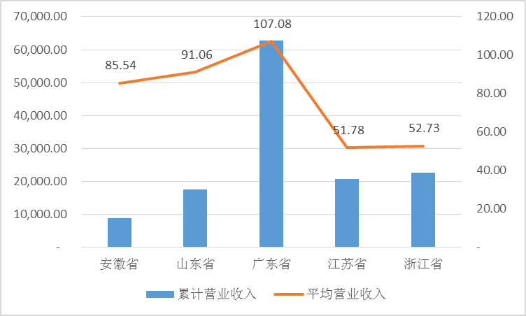 2018年安徽上市公司累計(jì)營(yíng)業(yè)總收入與廣東、山東、江蘇及浙江相比,僅為廣東省2018年累計(jì)營(yíng)業(yè)總收入(62,751.75億元)的14.04%;報(bào)告期省內(nèi)A股上市公司的平均營(yíng)業(yè)總收入為85.54億元,高于江蘇省及浙江省,低于廣東省及山東省的平均營(yíng)業(yè)收入水平(見(jiàn)圖2-13)。