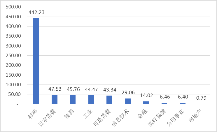 2018年安徽上市公司的凈資產(chǎn)指標(biāo)在不同行業(yè)中的分布差異仍較大。公用事業(yè)行業(yè)上市公司的平均凈資產(chǎn)為143.95億元,居所有行業(yè)首位;日常消費(fèi)、工業(yè)、醫(yī)療保健等行業(yè)上市公司的平均凈資產(chǎn)處于相對(duì)落后位置(見(jiàn)圖2-8)。由于各行業(yè)上市公司數(shù)量差距較大,行業(yè)平均凈資產(chǎn)排名第3的材料業(yè)在累計(jì)凈資產(chǎn)規(guī)模方面卻高于排名前2位的公用事業(yè)和金融行業(yè)(見(jiàn)圖2-9)。