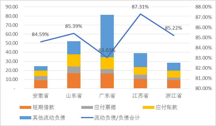 2018年安徽上市公司“流動(dòng)負(fù)債/負(fù)債合計(jì)”指標(biāo)為84.59%(見(jiàn)圖2-23)。2018年度安徽上市公司的短期借款在流動(dòng)負(fù)債中占比最大,約為36.61%;其次為應(yīng)付賬款和應(yīng)付票據(jù),分別為26.72%、12.34%。與之相比,浙江省、山東省與安徽情況相似,流動(dòng)負(fù)債中均是短期借款占比最大;而在廣東與江蘇省中者占比最大的是其他流動(dòng)負(fù)債(分別為57.48%和39.26%),但短期借款仍是第二大占比的科目(分別為20.39%和27.19%)。