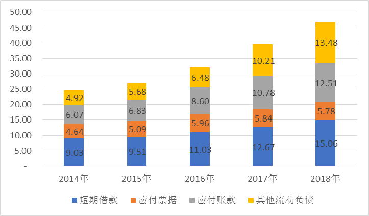 2014年至2018年,安徽上市公司的流動(dòng)負(fù)債總額呈逐年上升的趨勢(shì)(見(jiàn)圖2-24),流動(dòng)負(fù)債金額從2014年的24.66億元,增加至2018年達(dá)到46.83億元;從構(gòu)成上看,近年來(lái)短期借款的占比始終保持最高;應(yīng)付票據(jù)占比逐年下降,其他流動(dòng)負(fù)債比重則逐年提升。