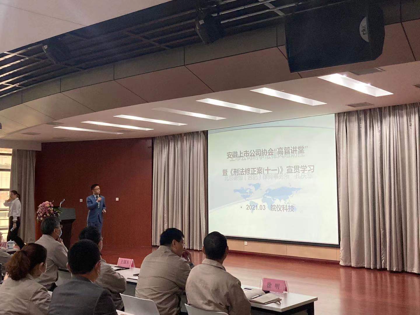 3月31日,安徽上市公司協(xié)會“高管講堂”第九講在皖儀科技舉辦。公司全體董事、監(jiān)事及公司中層及以上員工、重要子公司負責人等100余人參加培訓。皖儀科技董事長臧牧、董秘王勝芳出席活動。