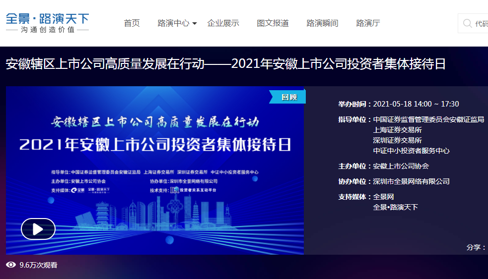 5月18日,我會主辦的“2021年安徽上市公司投資者集體接待日”活動成功舉行,安徽轄區(qū)67家上市公司的近200名董事長、總經(jīng)理等高管通過全景網(wǎng)參與了線上活動,參與、觀看者接近十萬人次。