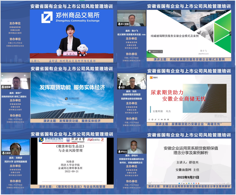 在專題授課中,鄭商所研究所研究二部部長韓學(xué)廣,同濟(jì)大學(xué)法學(xué)院副教授劉春彥,信義玻璃投資者關(guān)系總監(jiān)陳小飛,安徽輝隆農(nóng)資集團(tuán)氮肥事業(yè)部總經(jīng)理助理劉杰,安徽省農(nóng)學(xué)會(huì)油脂油料分會(huì)秘書長、安徽油脂網(wǎng)主任舒佳興五位嘉賓,圍繞大宗商品風(fēng)險(xiǎn)管理、套期保值理念、期貨市場服務(wù)實(shí)體經(jīng)濟(jì)的模式及實(shí)際案例等進(jìn)行了詳細(xì)分享,幫助相關(guān)企業(yè)提高對(duì)期貨市場的認(rèn)識(shí),用好期貨工具,有效規(guī)避原材料和產(chǎn)品價(jià)格波動(dòng)風(fēng)險(xiǎn),從而提升企業(yè)風(fēng)險(xiǎn)管理能力,實(shí)現(xiàn)高質(zhì)量健康發(fā)展。